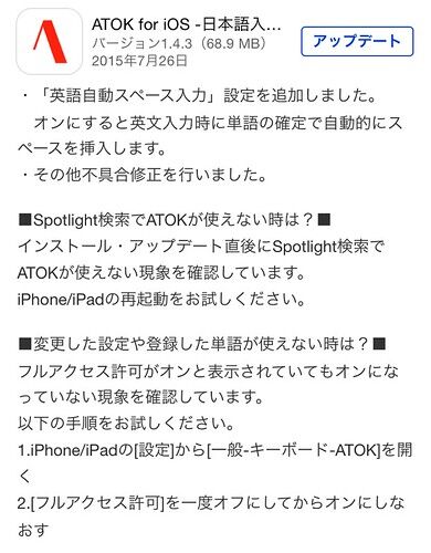 こんにちは, @the_theorierです. ATOK for iOSが1.4.3へアップデートし, どうやら先日報告したバグも収まったようです. バージョン1.4.3では, 不具合修正のほか「英語自動スペース入力」機能が追加されました. アプリを起動し, 「設定」をタップ, 「英語自動…